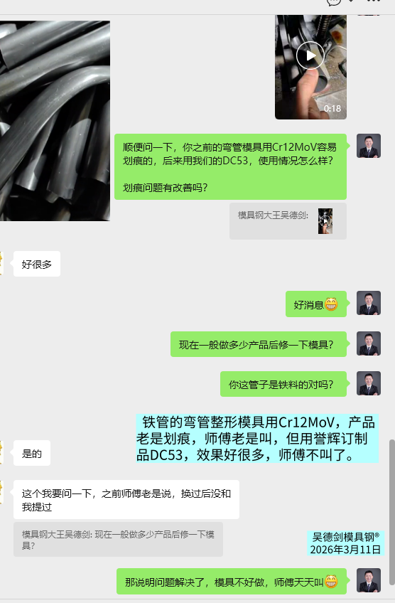 转载请注明:模具钢_模具钢材_h13模具钢_模具钢价格 - 模具钢大王吴德剑 » 收到胡先生好评反馈:自从用了誉辉DC53,模具师傅再也不叫了