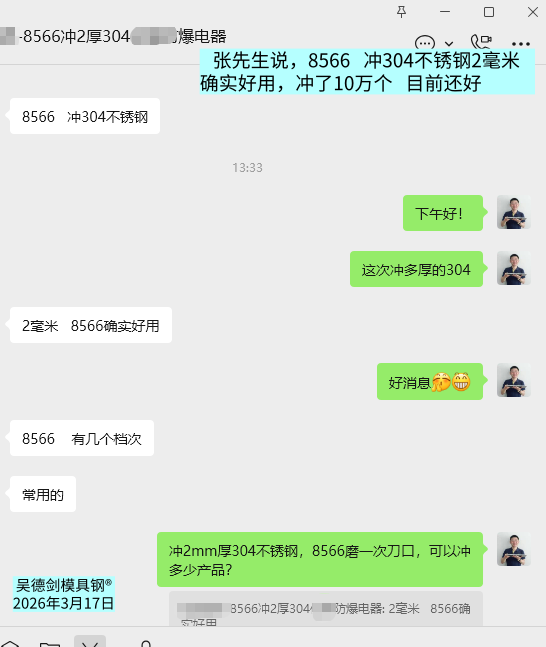 转载请注明:模具钢_模具钢材_h13模具钢_模具钢价格 - 模具钢大王吴德剑 » 收到张先生好消息,8566防崩钢冲压10万不坏