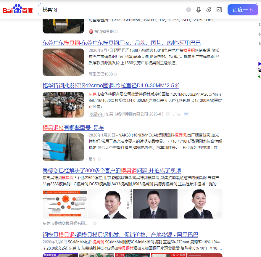 转载请注明:模具钢_模具钢材_h13模具钢_模具钢价格 - 模具钢大王吴德剑 » “模具钢”这个核心关键词,吴德剑模具钢官网已经上到百度第二页了