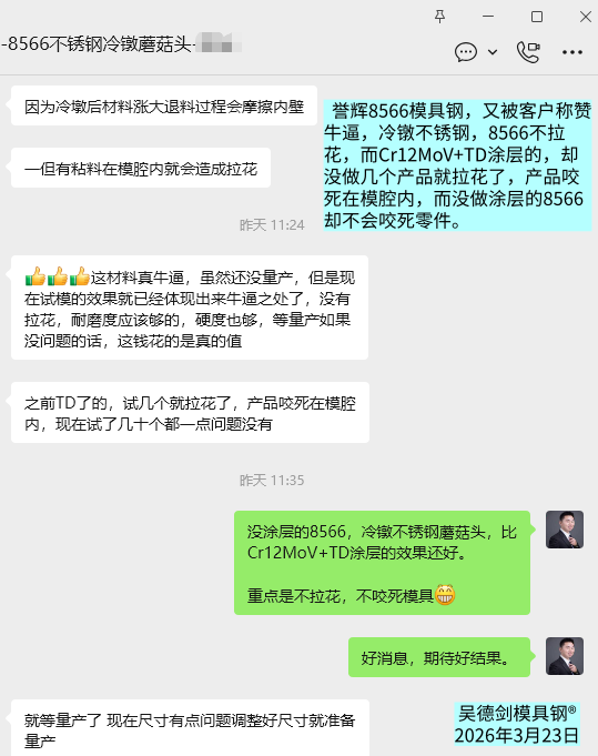 邹先生是冷镦不锈钢的模具,把不锈钢圆棒头部拍扁成蘑菇头,模具原来用Cr12MoV+TD涂层的,却没做几个产品就拉花了,产品咬死在模腔内,而现在用没做涂层的8566,却不会咬死零件,邹先生感到惊奇。
