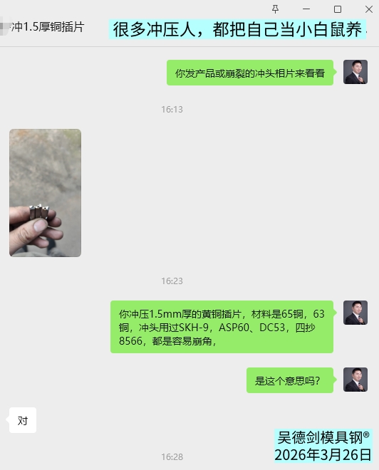 今天下午邹先生来咨询,冲压1.5mm厚的黄铜插片,材料是65铜、63铜的都有,冲头用过SKH-9、ASP60、DC53,四抄8566,都是容易崩角,现在准备再试试H13和SKD61。