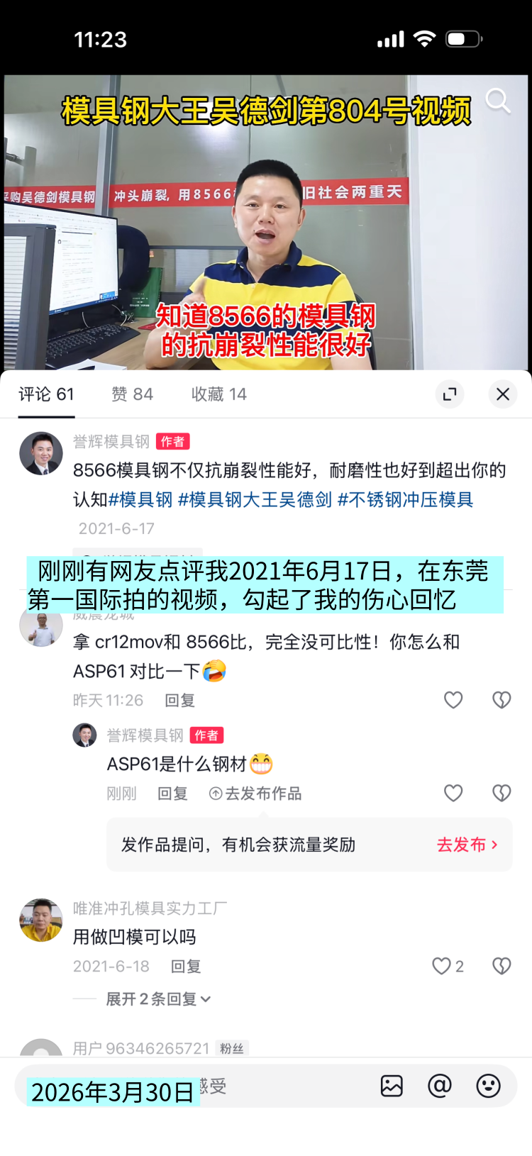 转载请注明:模具钢_模具钢材_h13模具钢_模具钢价格 - 模具钢大王吴德剑 » 网友点评我2021年拍的视频,勾起了我的伤心回忆