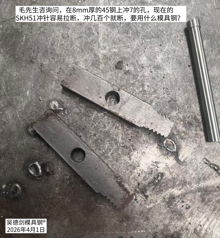 毛先生咨询问,在8mm厚的45钢上冲7的孔,现在的SKH51冲针容易拉断,冲几百个就断,要用什么模具钢?