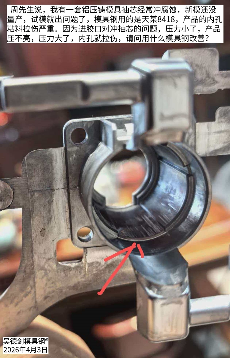 今早收到周先生咨询,我有一套铝压铸模具抽芯经常冲腐蚀,新模还没量产,试模就出问题了,模具钢用的是天某8418,产品的内孔粘料拉伤严重。请问用什么模具钢改善?