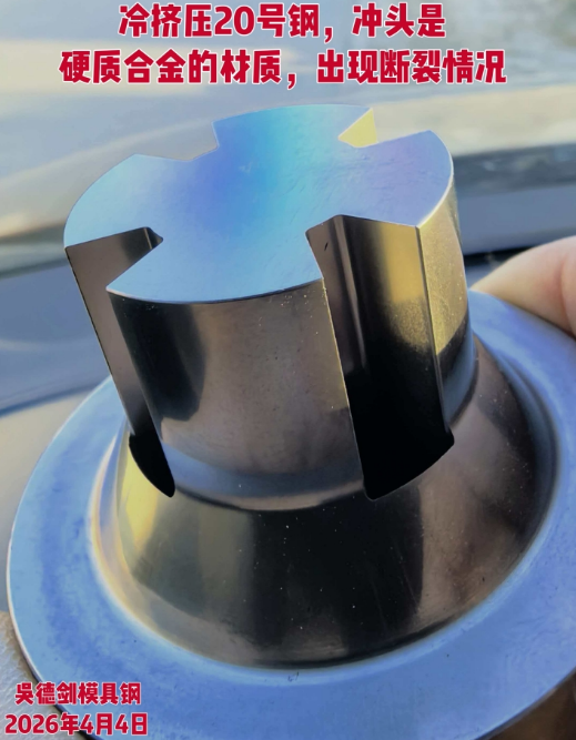 今天刚下飞机,收到赵先生咨询,冷挤压20号钢,冲头是硬质合金的材质,出现断裂情况,请问有什么模具钢硬度高点,韧性比钨钢好的。