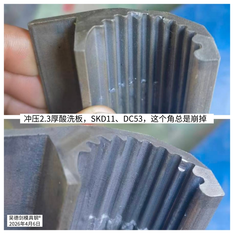 收到网友咨询,冲压2.3厚酸洗板,SKD11、DC53,这个角总是崩掉。