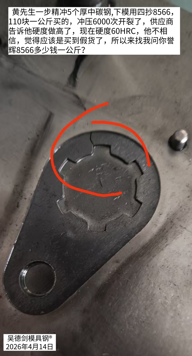 经过一番细聊后得知,黄先生是一步精冲5mm厚的中碳钢,下模用四抄8566模具钢,110块一公斤买的8566,冲压6000次开裂了,供应商告诉他是硬度做高了,现在硬度60HRC,他不相信,觉得应该是买到假货了,所以来找我问,你誉辉8566模具钢多少钱一公斤?