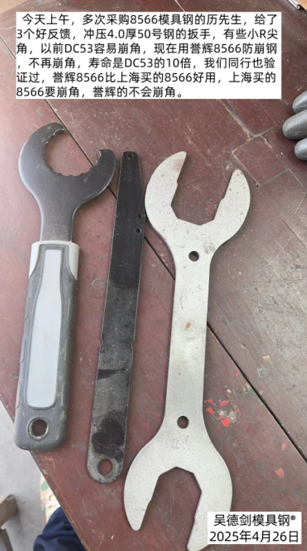 多次采购8566模具钢的历先生,给了3个好反馈,冲压4.0厚50号钢的扳手,有些小R尖角,以前DC53容易崩角,现在用誉辉8566防崩钢不再崩角,寿命是DC53的10倍,我们同行也验证过,誉辉8566比上海买的8566好用,上海买的四抄8566要崩角,誉辉的不会崩角。