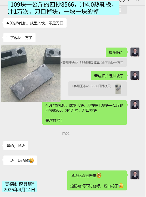 109块一公斤的四抄8566,冲4.0热轧板,冲1万次,刀口就掉块,一块一块的掉。
