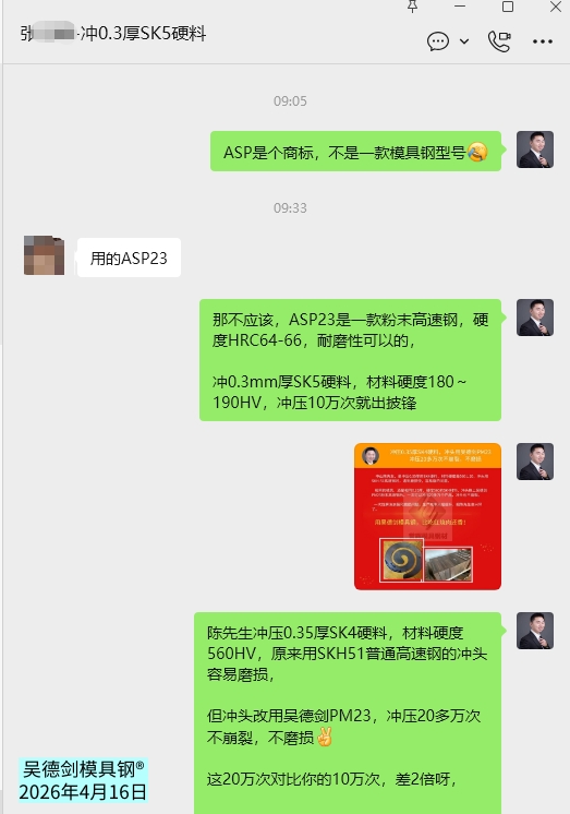 而这两个案例的被冲材的材质一样,选用的模具钢一样,厚度更厚的,硬度更硬的,寿命却多了1倍,所以有理由怀疑,该网友的ASP23,冶炼质量是值得怀疑的。