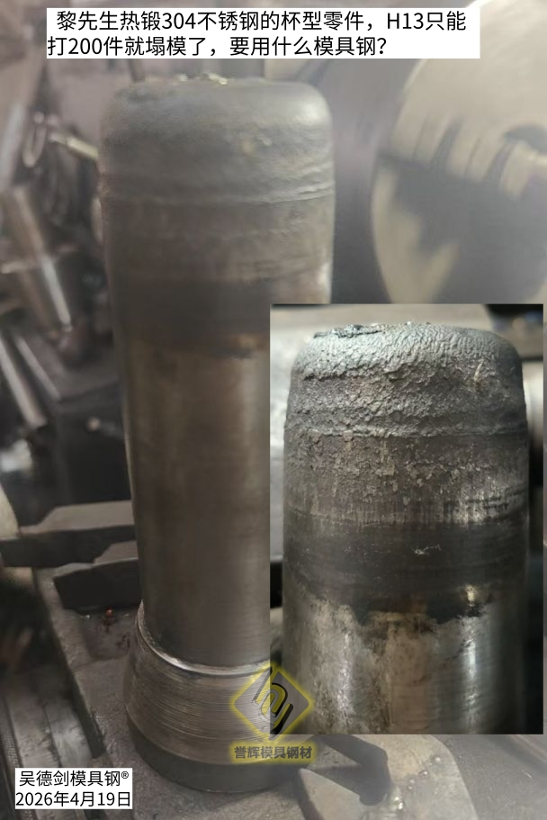黎先生是热锻304不锈钢的杯型零件,冲头直径65mm,高度50的冲棒用H13,只能打200件就塌模开裂了,冲头就报废了,200件就要换冲头,寿命太短,效率做不起来。