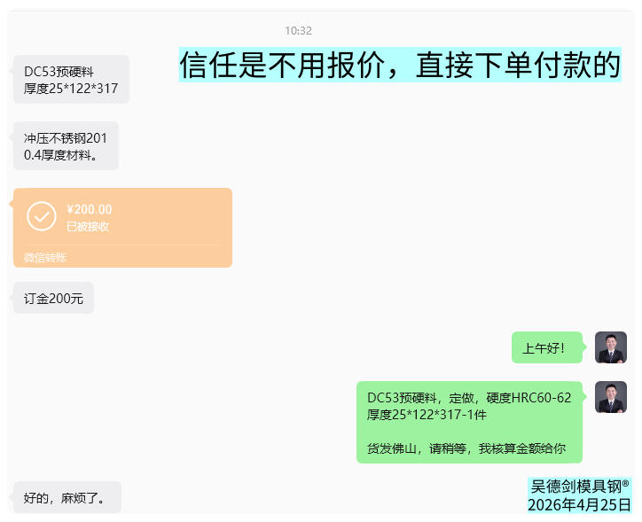 转载请注明:模具钢_模具钢材_h13模具钢_模具钢价格 - 模具钢大王吴德剑 » 信任你的客户:不需要报价,而是直接下单给定金