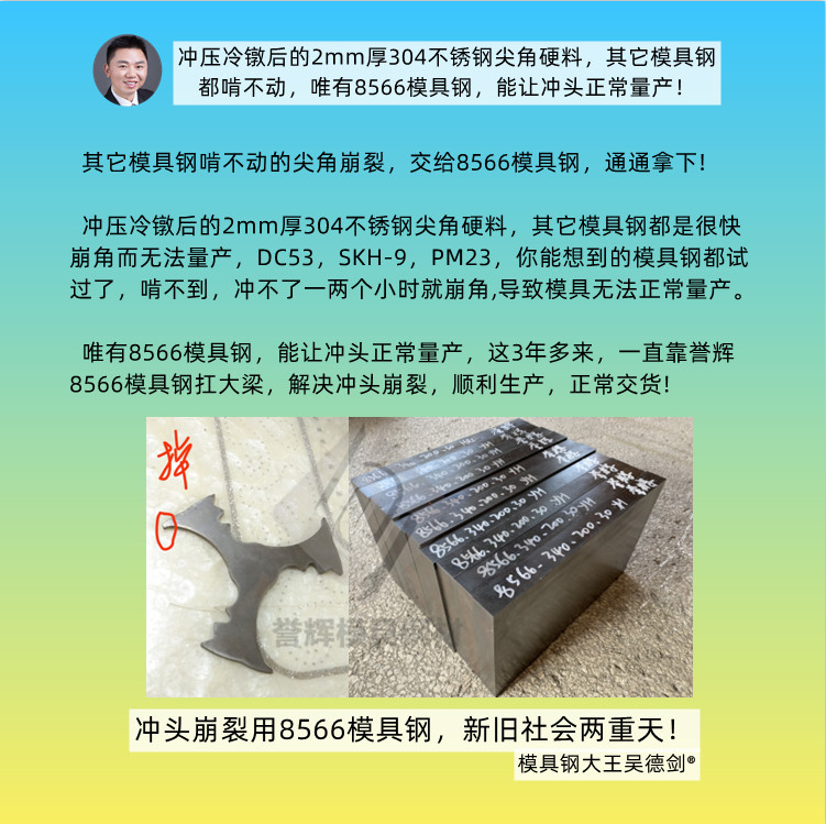 还有冲压冷镦过后的2mm厚的不锈钢硬料,又是窄边尖角的产品,其它模具钢都啃不动,DC53、SKH-9、PM23都歇菜,唯一吴德剑的8566模具钢,能让模具正常冲压,正常量产,唐先生说,真的的应了那句话,冲头崩裂用8566模具钢,新旧社会两重天!
