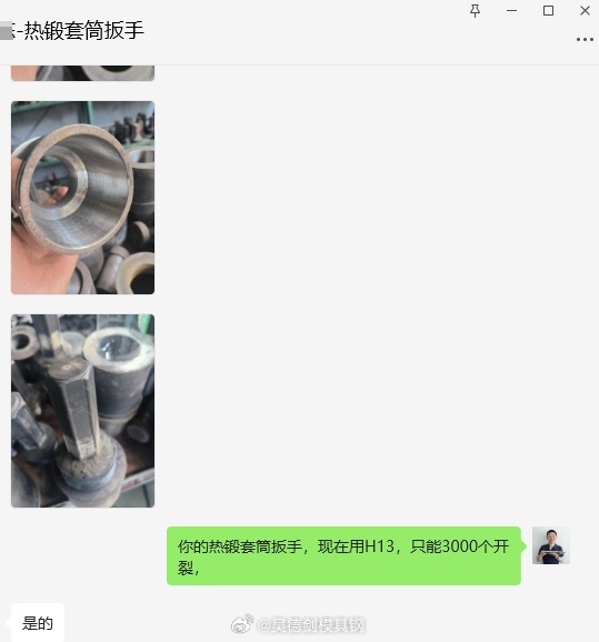 第一个是热锻套筒扳手,现在底模和冲头都用H13模具钢,底模是有外套箍紧的深坑结构,冲头是有六角的结构,可是都是模具寿命太短,底模只能到3000来个产品,模具就起拉丝,产品起划痕,就要修模了。冲头寿命更短,H13只能做1000~1500个产品,冲头就塌模龟裂了,就要修一下,寿命太短,没有效率,想延长模具什么,请问要用什么模具钢。