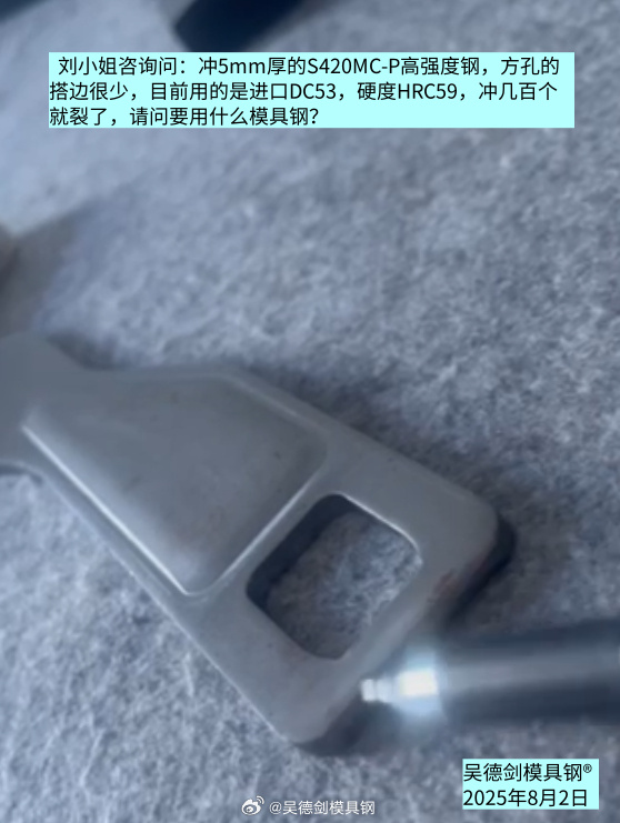 刘小姐咨询问:冲5mm厚的S420MC-P高强度钢,方孔的搭边很少,目前用的是进口DC53,硬度HRC59,冲几百个就裂了,请问要用什么模具钢?