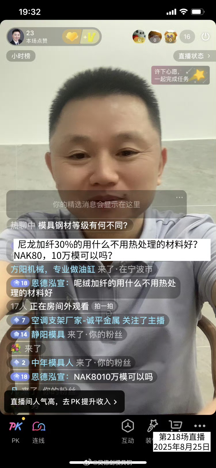第218场直播间网友提问,尼龙加纤30%的用什么不用热处理的材料好?NAK80,10万模可以吗?
