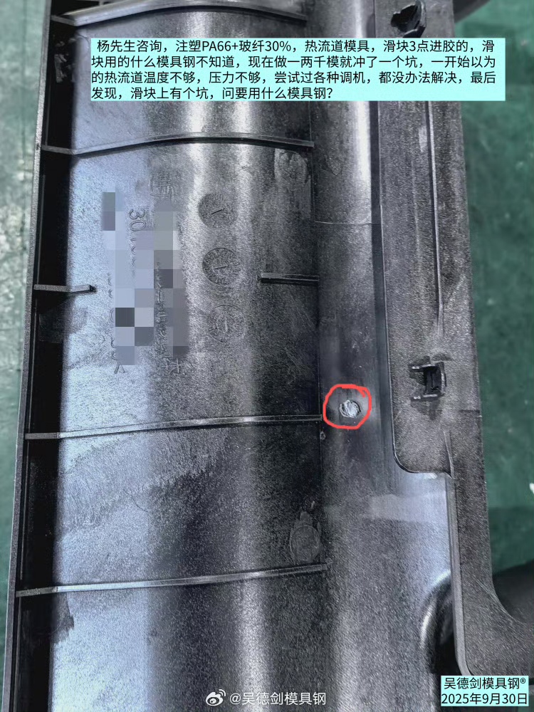 收到杨先生咨询,注塑PA66+玻纤30%,热流道模具,滑块3点进胶的,滑块用的什么模具钢不知道,现在做一两千模就冲了一个坑。一开始以为的热流道温度不够,导致流动性不够,又以为压力不够,尝试过各种调机,都没办法解决,最后发现,滑块上有个坑,问要用什么模具钢?