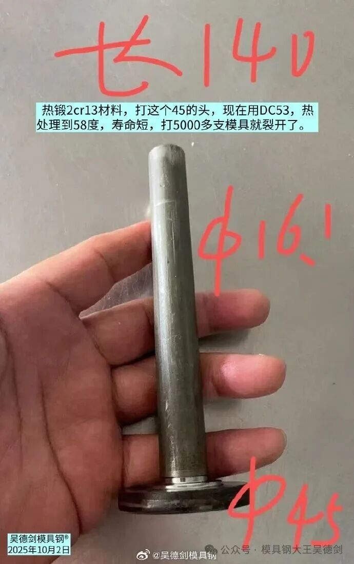 收到网友咨询问:热锻2Cr13材料,打这个45的头,现在用DC53,热处理到58度,寿命短,打5000多支模具就裂开了。