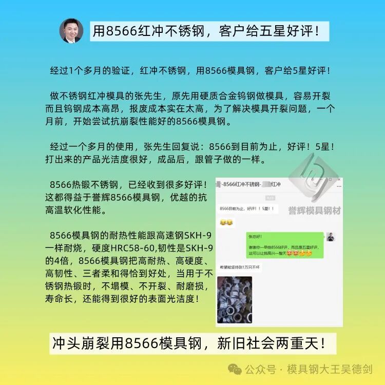 但后来用誉辉8566模具钢,不再塌模和开裂,冲头寿命长,一根冲头可以降面6次,每次寿命也不减,重点是打出来的产品光洁度好,客户喜欢。