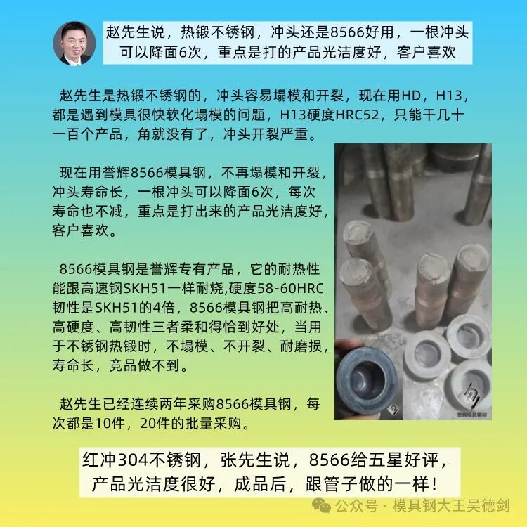 赵先生是热锻不锈钢的杯型零件,冲头容易塌模和开裂,HD,H13都是很快软化塌模,H13硬度HRC52,只能干几十一百个产品,就磨出圆角了,冲头开裂严重。