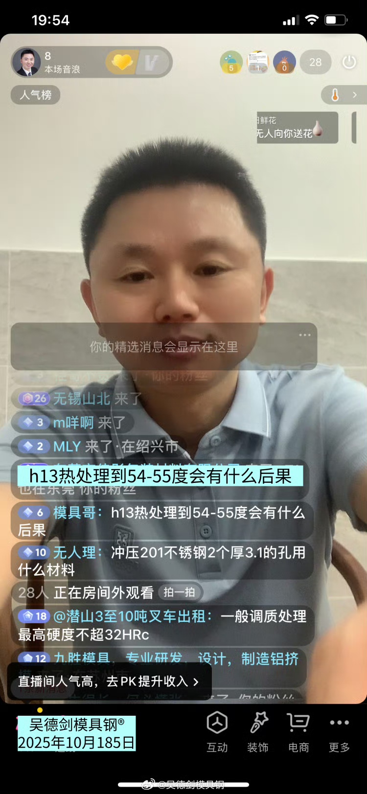 转载请注明:模具钢_模具钢材_h13模具钢_模具钢价格 - 模具钢大王吴德剑 » 直播间网友提问:H13热处理到54-55度会有什么后果?
