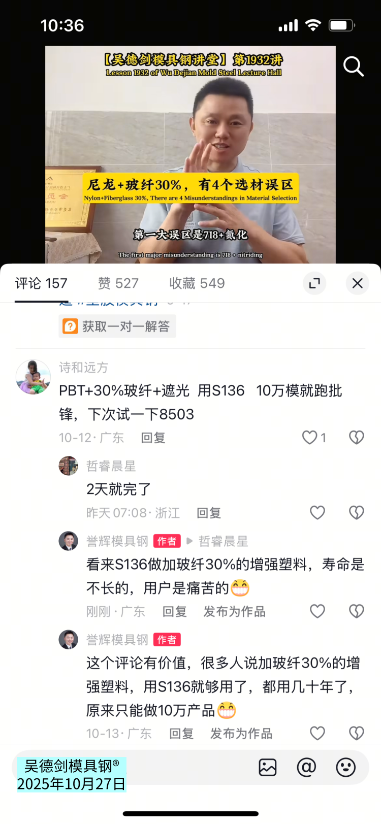 有网友不服气,跟评说,PBT+30%玻纤+遮光 用S136 10万模就跑批锋,下次试一下8503模具钢。