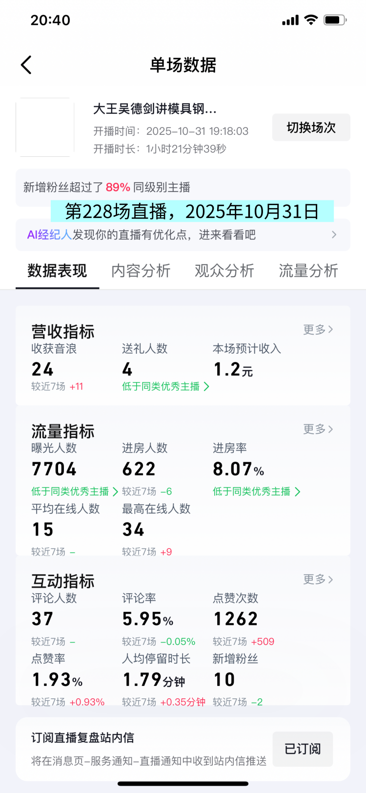 2025年10月31日,我做了1小时的直播,这是本周的第5场,也是我的第228场直播。
