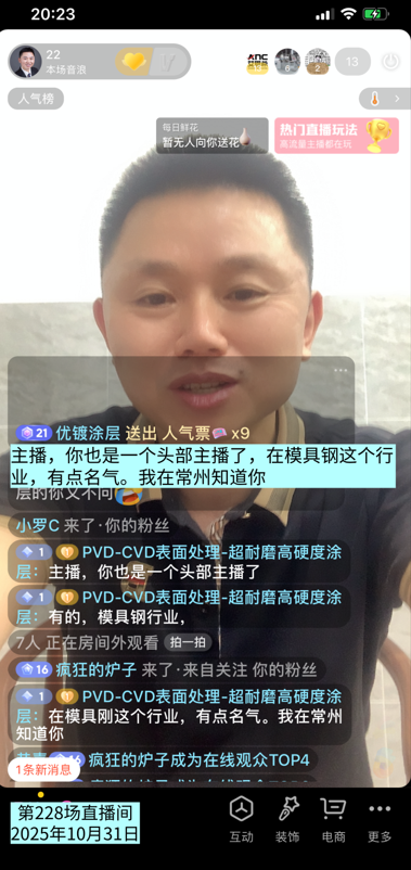 第228场直播间有网友说:主播,你也是一个头部主播了,在模具钢这个行业,有点名气。我在常州知道你。