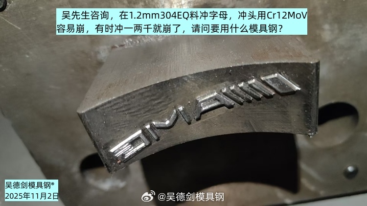 吴先生咨询,在1.2mm304EQ料冲字母,冲头用Cr12MoV,容易崩,有时冲一两千就崩了,请问要用什么模具钢?