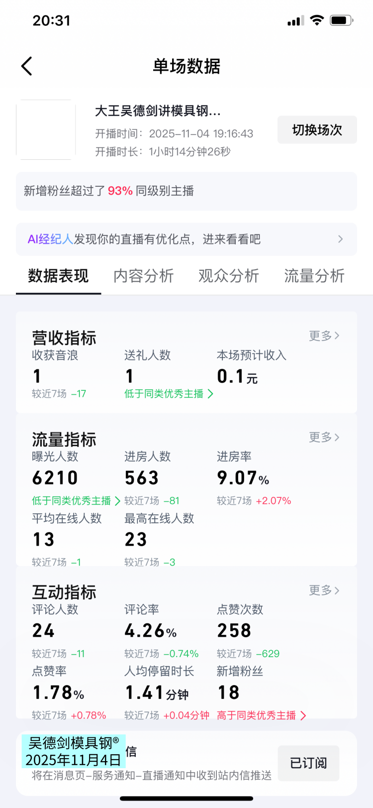 这场直播的曝光人数6210人次,观众人数563人,人均停留时长1.41分钟,这场直播数据跟之前的比较有所降低。不管数据有没有下降,我都是要播的,记录数据,只是为了记录成长点滴。