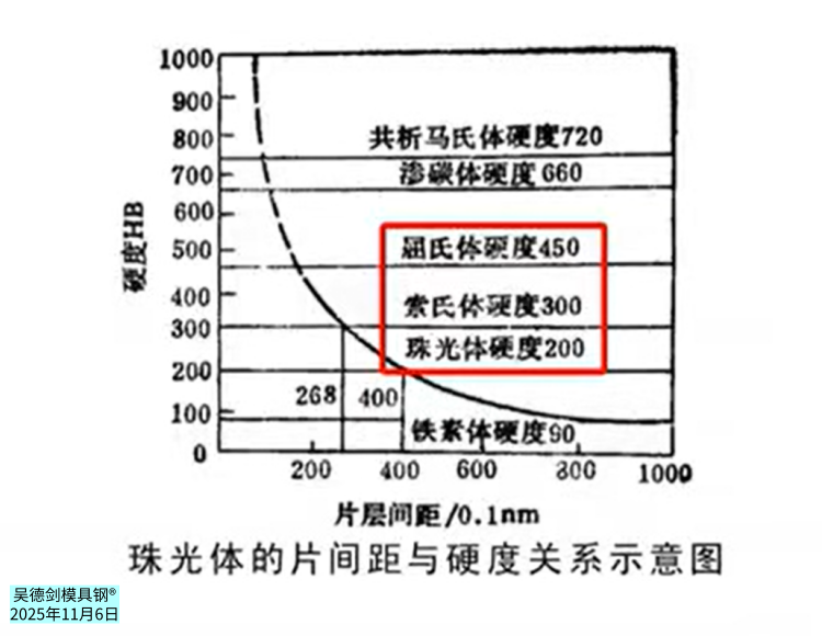 从珠光体的片间距与硬度关系示意图可以看出,共析马氏体硬度最高720HB;其次是渗碳体硬度660HB;第三是屈氏体硬度450HB;索氏体硬度300HB,珠光体硬度200HB;铁素体硬度硬度最低90HB。