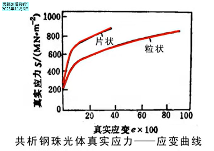 从共析钢珠光体真实应力,应变曲线的示意图中,也可以看出,片状珠光体的强度高于粒状珠光体,但韧性却很差。而粒状珠光体强度虽然较片状珠光体差一点点,但韧性却大幅提升,而且切削加工性能也更好好。