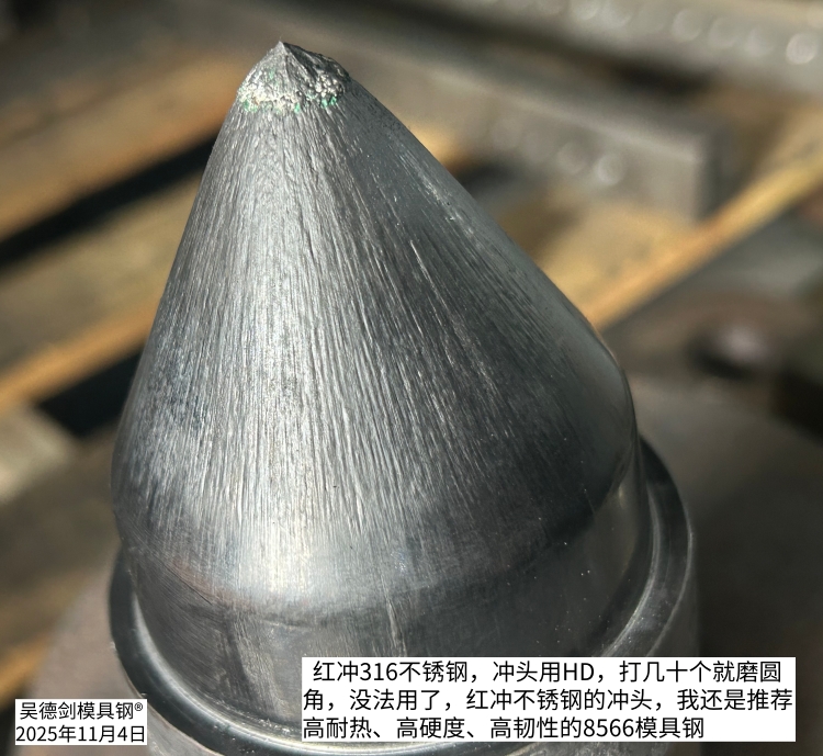 前段时间表扬过8566的刘先生,昨天又来说,这次红冲316不锈钢,产品数量不多,订单才1000多个,以为产品数量不多,冲头就用了HD模具钢,但打几十个就磨圆角,尖角都磨没了,表面也拉痕严重,这打几十个就坏,生产也没法用了,还是买块8566模具钢吧,锻造不锈钢产品,8566比较耐用的,之前用过好几批了。