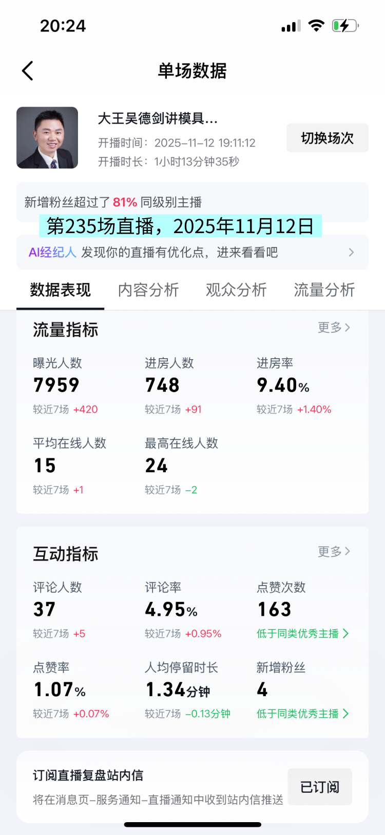 昨天11月12日晚,我做了1小时直播,这是我第235场直播。