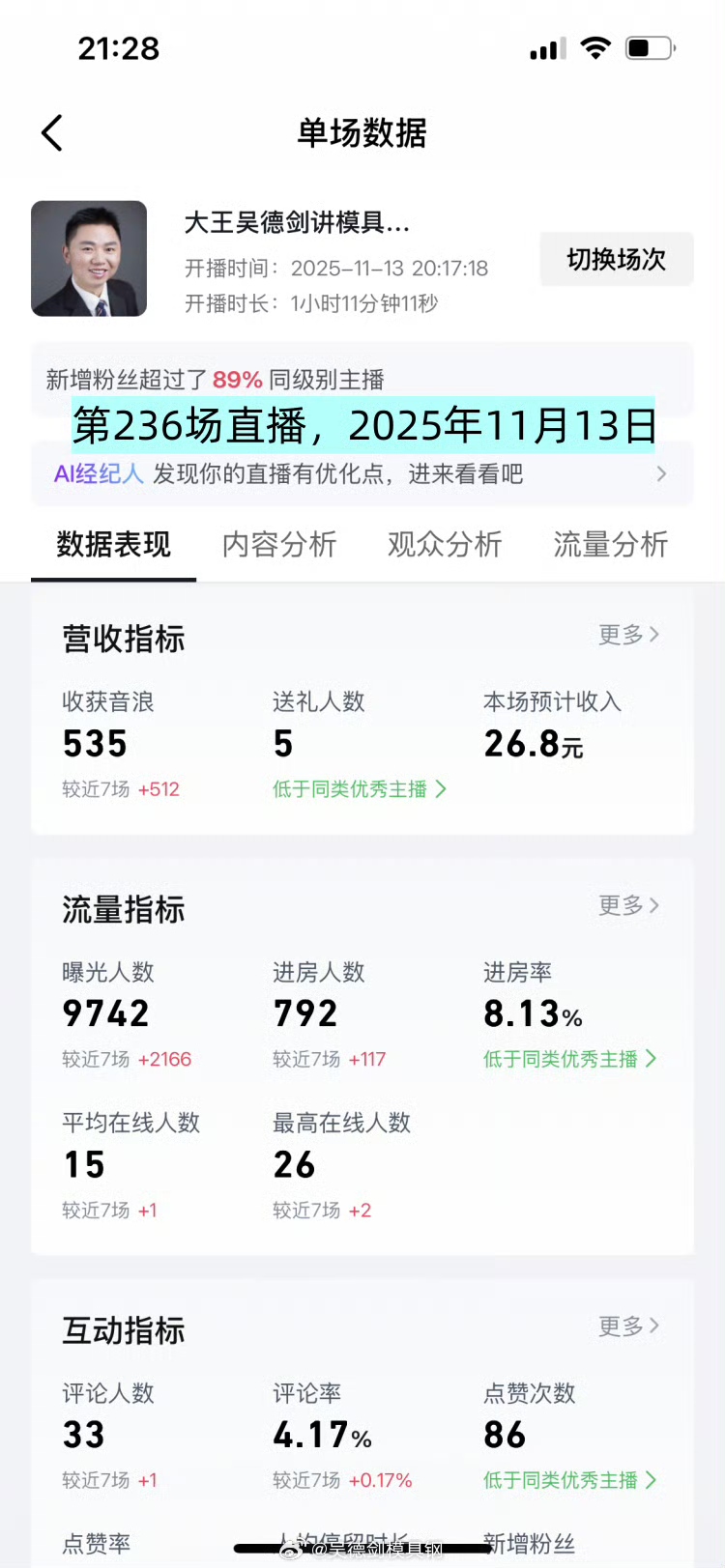 昨天11月13日晚,我做了1小时直播,这是我第236场直播。