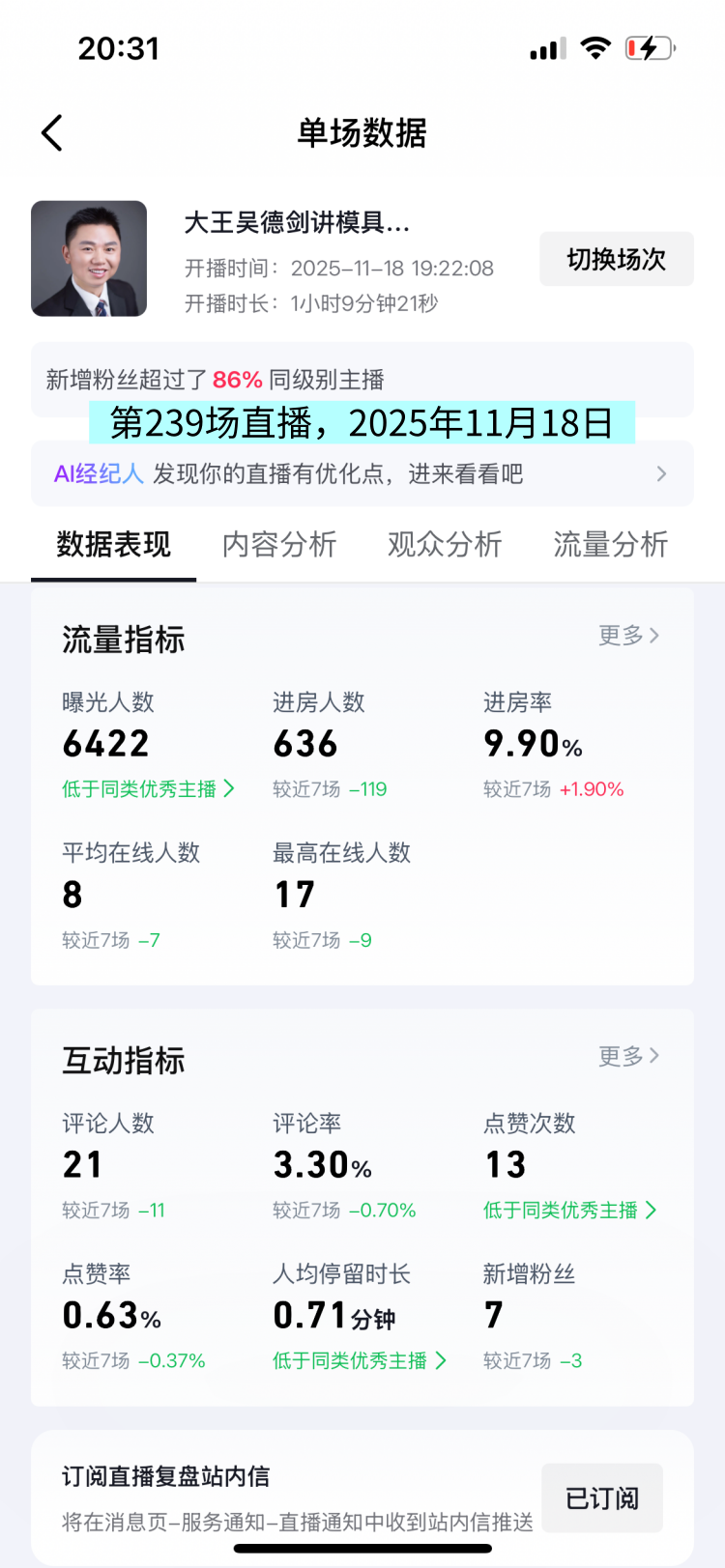 昨天11月18日晚,我直播了1小时,这是我第239场直播。