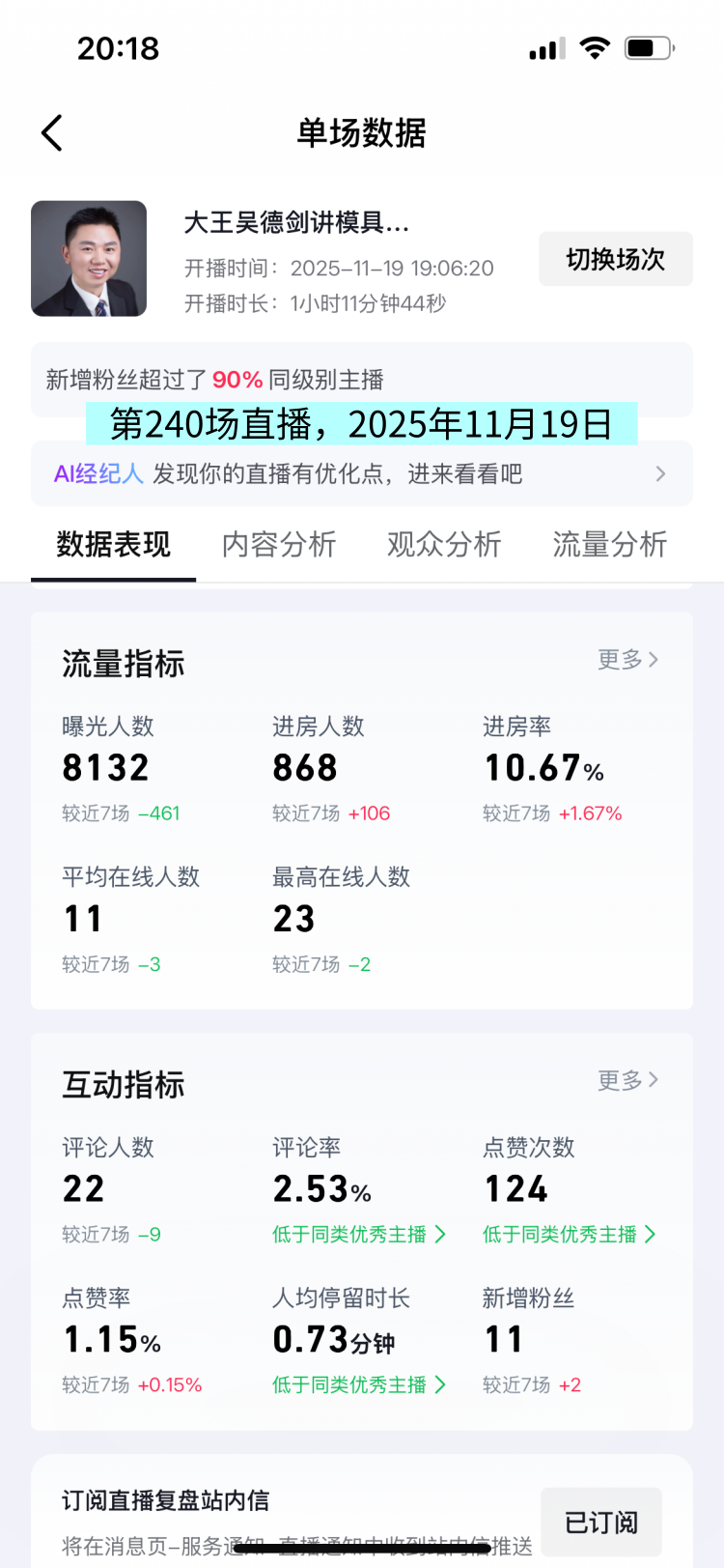 今晚11月19日,我直播了1小时,这是我第240场直播。