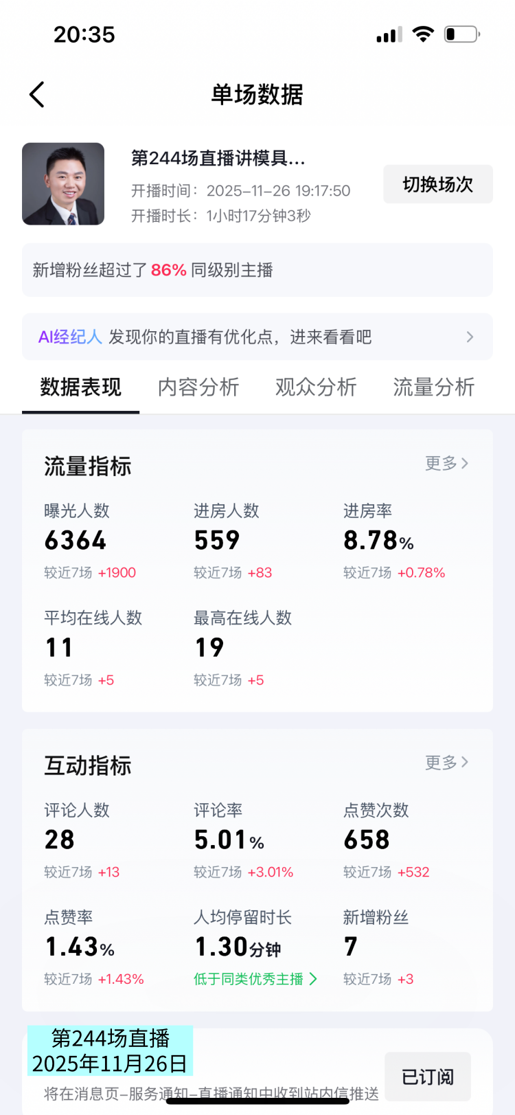 昨天晚上11月26日,我直播了1小时,这是我的第244场直播。