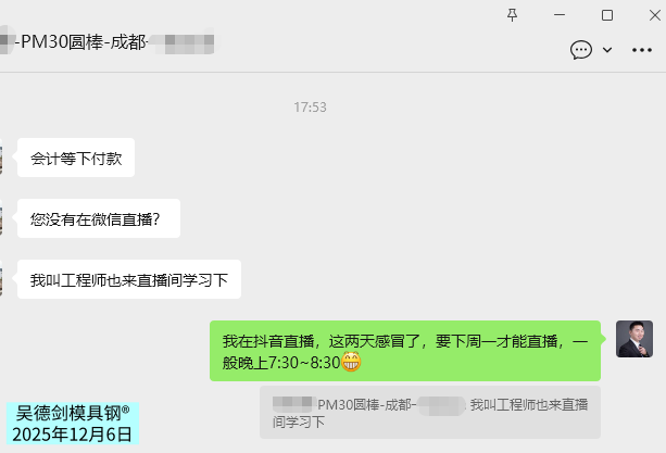 两天没直播,还有人催了。 看来很多有人关心模具钢的,但不是我不播,是这两天感冒了,一把鼻涕,一把泪的,没法播。 周一肯定开播的,请放心,晚上七点半来就行了。 #模具钢大王吴德剑 转载请注明:模具钢_模具钢材_h13模具钢_模具钢价格 - 模具钢大王吴德剑 » 两天没直播,还有人催了 喜欢 (0)