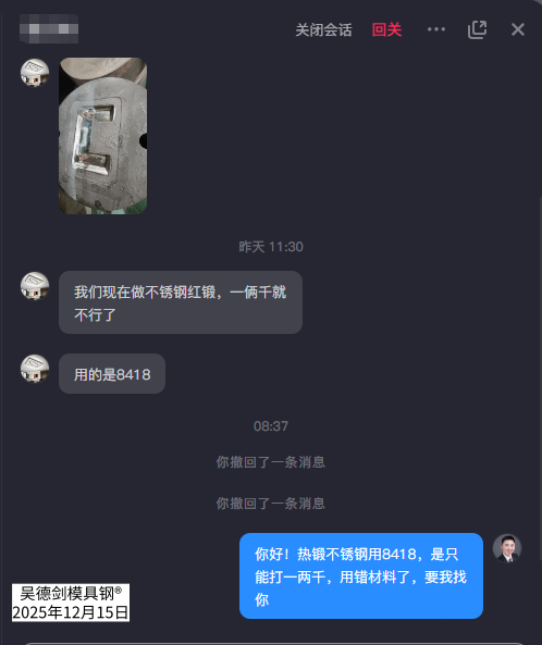 抖音上收到简先生问,做不锈钢红锻,一两千就不行了,用的是8418模具钢,有什么好材料推荐?