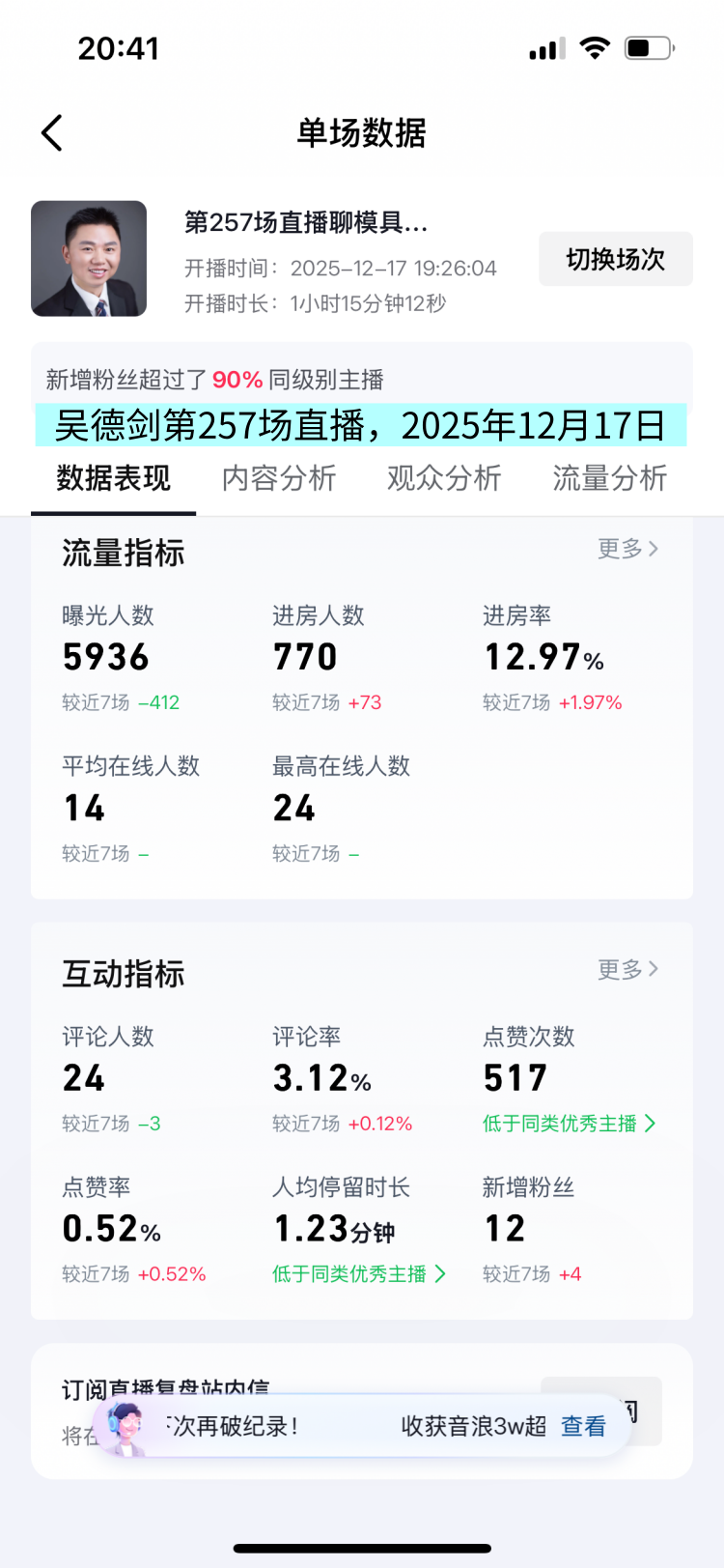 12月17日晚上,我直播了1小时,这是我的第257场直播。