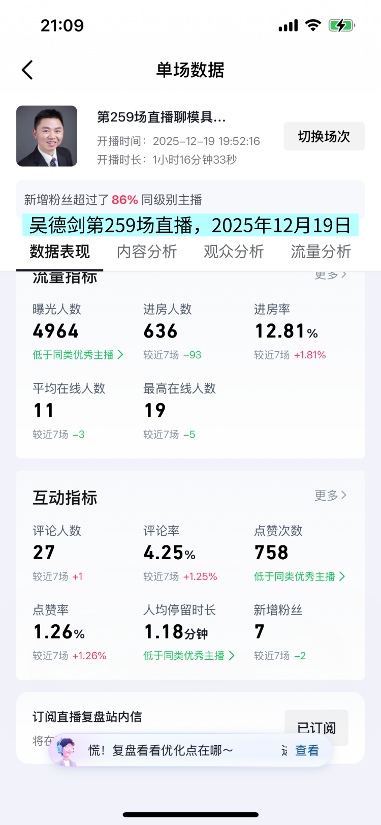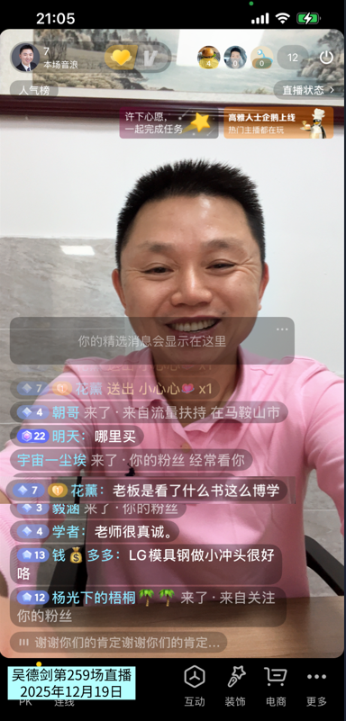 12月19日晚上,我直播了1小时,这是我的第259场直播。
