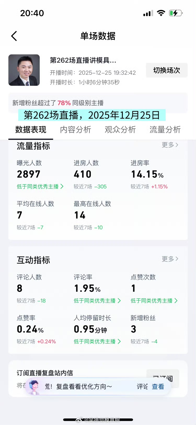 每年的12月25号是圣诞节,原本是个快乐的节日,可我遭遇了黑色星期四,昨天晚上,我照例做了1小时的直播,这也是我的第262场直播,但数据惨不忍睹。