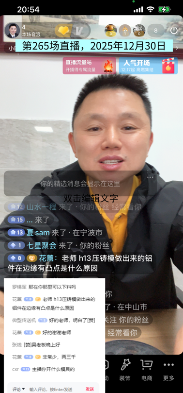 第265场直播间网友提问,H13压铸模做出来的铝件在边缘有凸点是什么原因?补充说两三千就出问题。