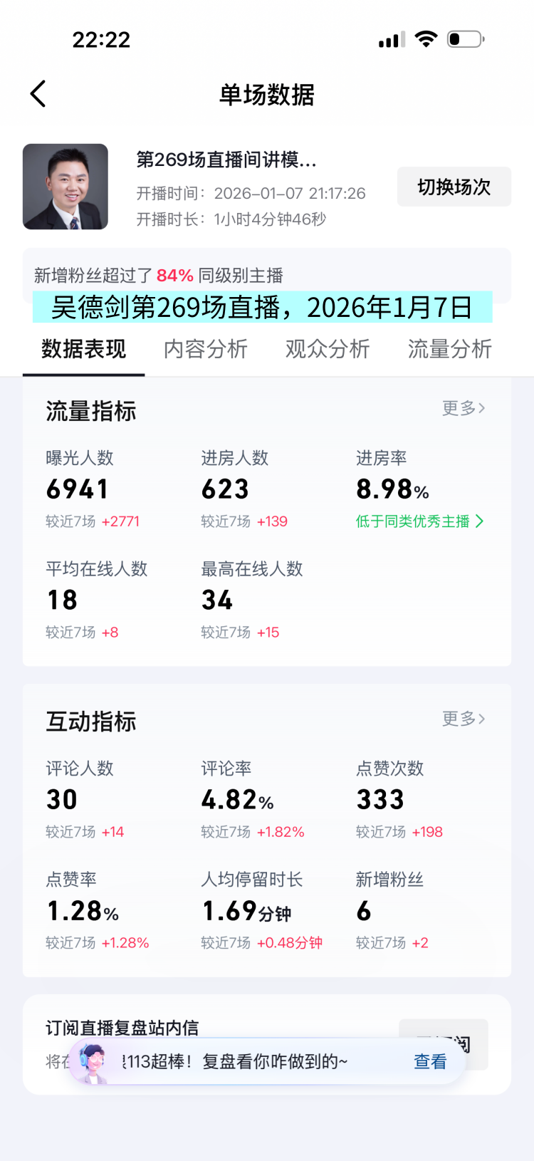 这场直播间的曝光人数6941人,观众623人,人均观看时长1.69分钟,平均在线人数18人,最高在线人数34人,这场直播数据,总算来了一波小阳春。大盘已经4个小阳春了,我的直播数据才第一个小阳春,希望与大盘同步,继续飘红。