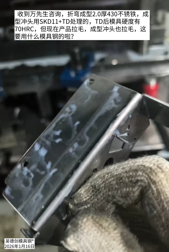 收到万先生咨询,折弯成型2.0厚430不锈铁,成型冲头用SKD11+TD处理的,TD后模具硬度有70多度,但现在产品拉毛,成型冲头也拉毛,这要用什么模具钢的啦?