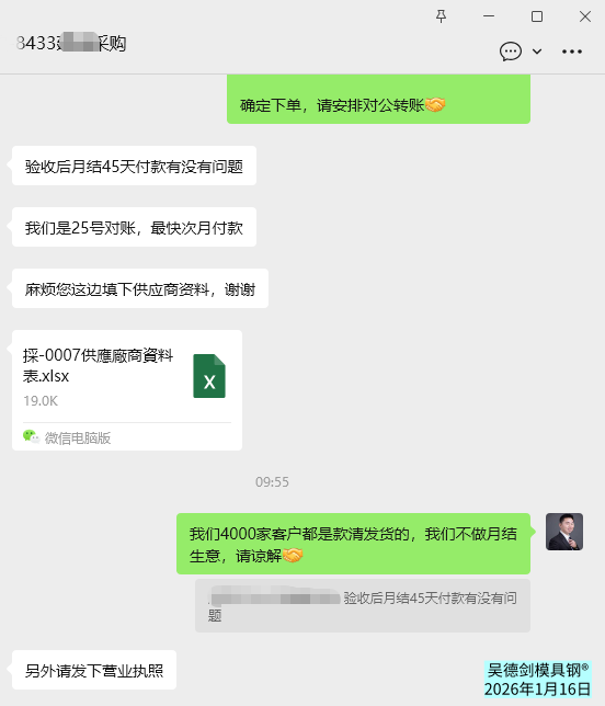 转载请注明:模具钢_模具钢材_h13模具钢_模具钢价格 - 模具钢大王吴德剑 » 采购问我:验收后月结45天付款有没有问题?