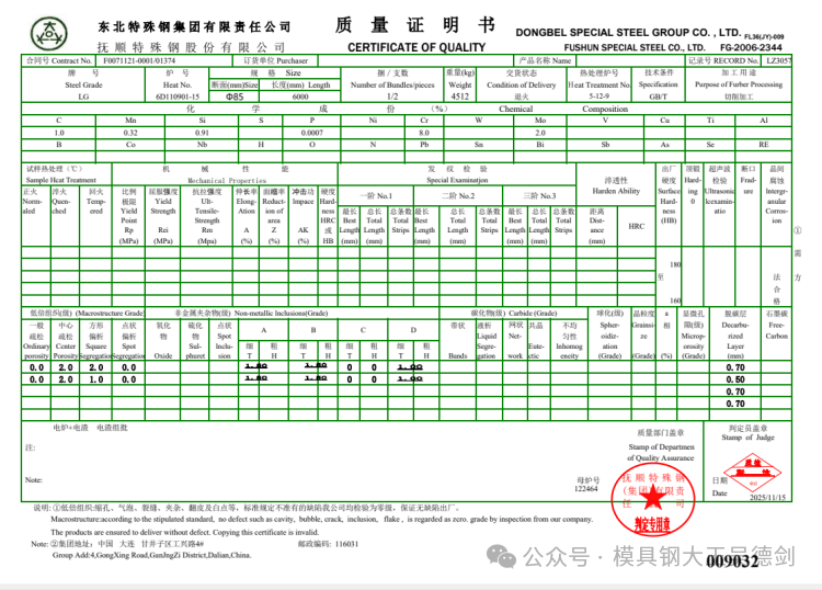 LG是誉辉模具钢专有的一款高韧性模具钢,它的韧性是DC53的8~9倍,硬度HRC54-58,韧性好到敲弯它也不断裂,但LG模具钢不是国家牌号,是我们誉辉公司的牌号,是我们的知识产权,不具有公共属性。现在的LG模具钢,已经是全网同行都在抄的四抄模具钢,如果有人提供给你某个钢厂的材质报告,肯定是假的。所谓的材质报告,只是P了个图给你而已,下面就有LG的材质报告,想要的,你拿去好了。