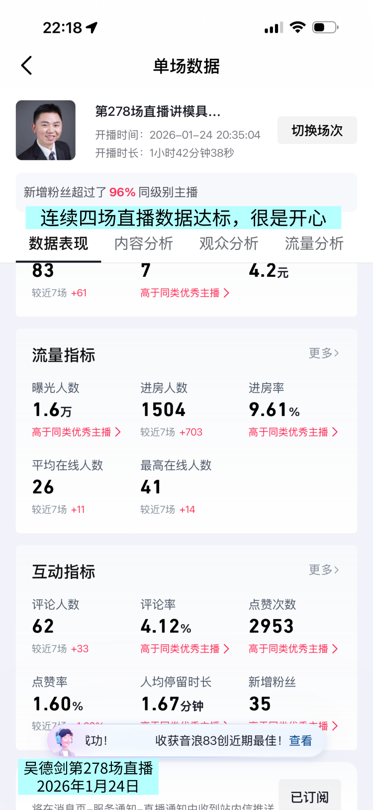 2026年1月24日星期六晚上,我做了1小时42分的直播,这是我的第278场直播。