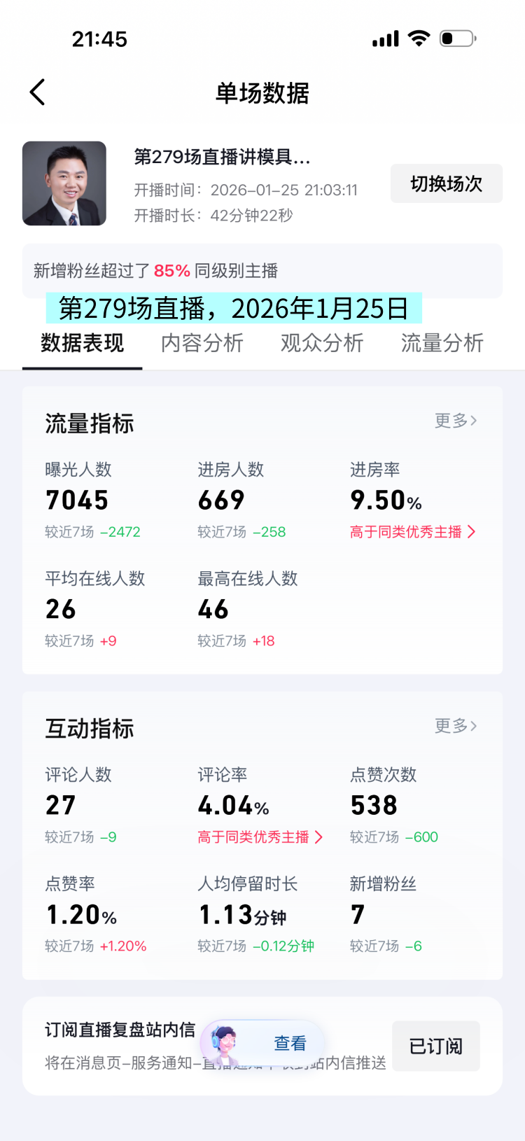 2026年1月25日星期日晚上,我做了42分的直播,这是我的第279场直播。